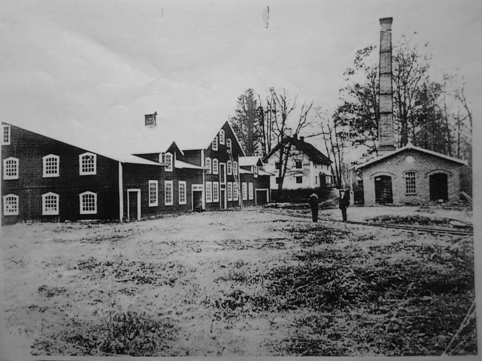 En bild från Carlsfors sågverk, 1920-1930-talet. Pannhuset till höger står fortfarande kvar med ångmaskinen, medan övriga byggnader brann ned i den stora branden 1932.